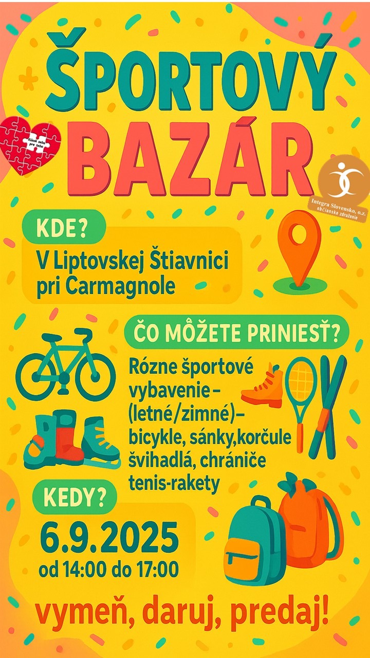 Pozývame všetkých 6.9.2025 od 14.00 hod do 17.00 hod, na veľký bazár športového náradia (walking palice, lyže, korčule, športové batohy-vaky, detské aj dospelácke bycikle, bedbintony, lopty)